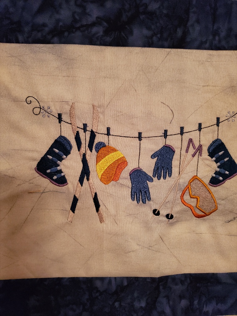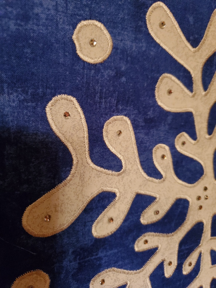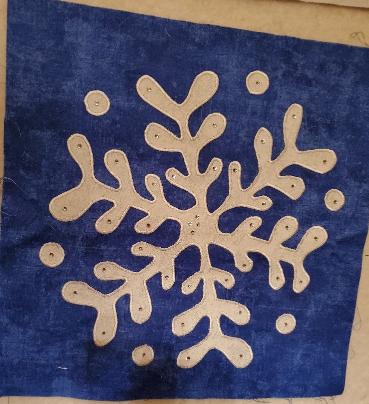 I made an appliqued snowflake. While the block looks simple, I finished all the edges with a satin stitch and there was a LOT of curves to go around.