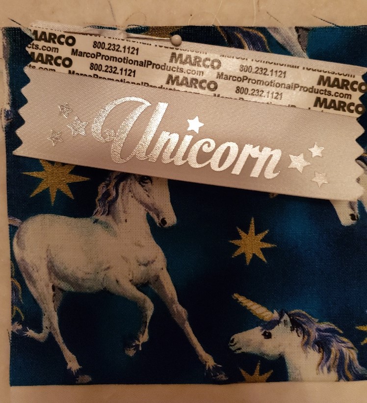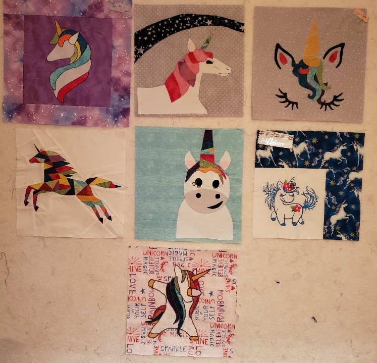 I'll show you the one that I made for each person. I had several pieces of unicorn fabric that I wanted to use but the scale was large and I didn't want to cut it up or cut the fabric as least as possible. I found this adorable machine embroidered unicorn, so I made that and then to make the block the required size, I added the unicorn fabric on two sides.