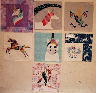 Each person should have eight blocks. The first one is Sacha's. You can see that she only has seven. I think it was her own block that was missing. Can you guess the theme?? Yep - it was unicorns. Some very colorful unicorns!