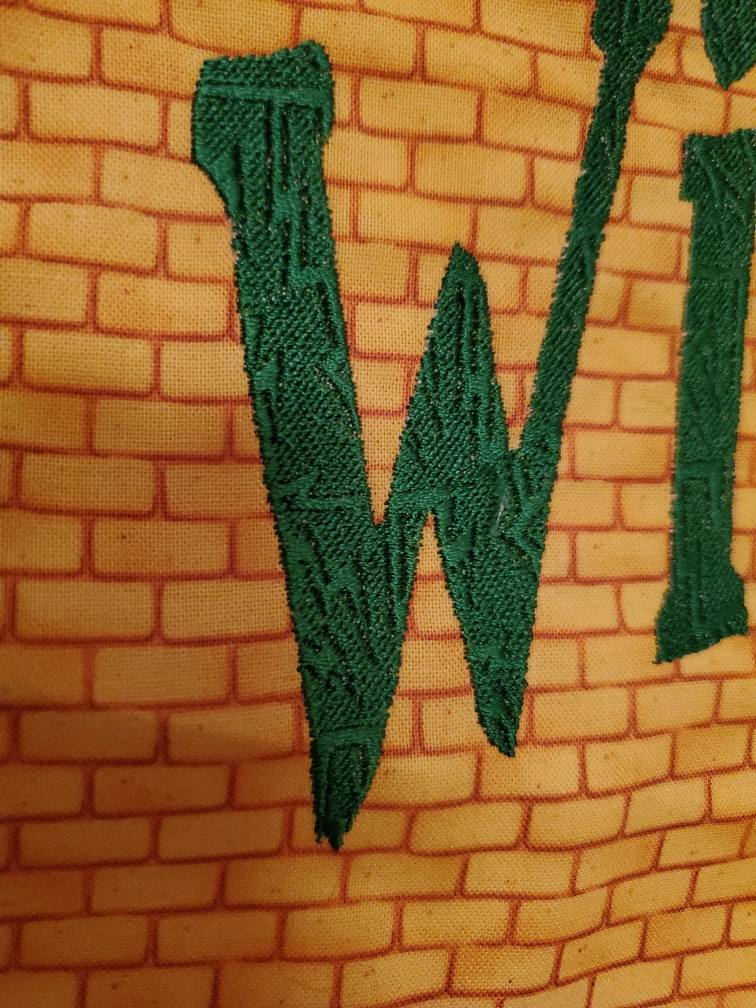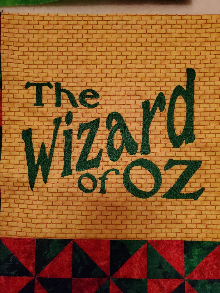 You got to love friends that ask things of you that you have no idea how to do! But it pushes you to learn new things. Ronda wanted the name of the movie on her block and could I do that on the embroidery machine? Hmm - maybe. So we searched the internet for the font and can you believe we found one, but I don't think the guy ever got back to us. I found a similar font in my embroidery software and used that to somewhat get the same effect as the movie title. It's not perfect, but it works. To really get the effect of the swirling letters, I should have brought each letter into the edit screen individually. I brought in each word so I was limited in how I could manipulate things.