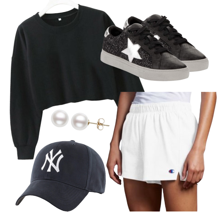 Bagilaanoe Top / Champion Shorts / MLB New York Yankees Basic Cap / Time and Tru Sneakers / Pearlzzz Earrings