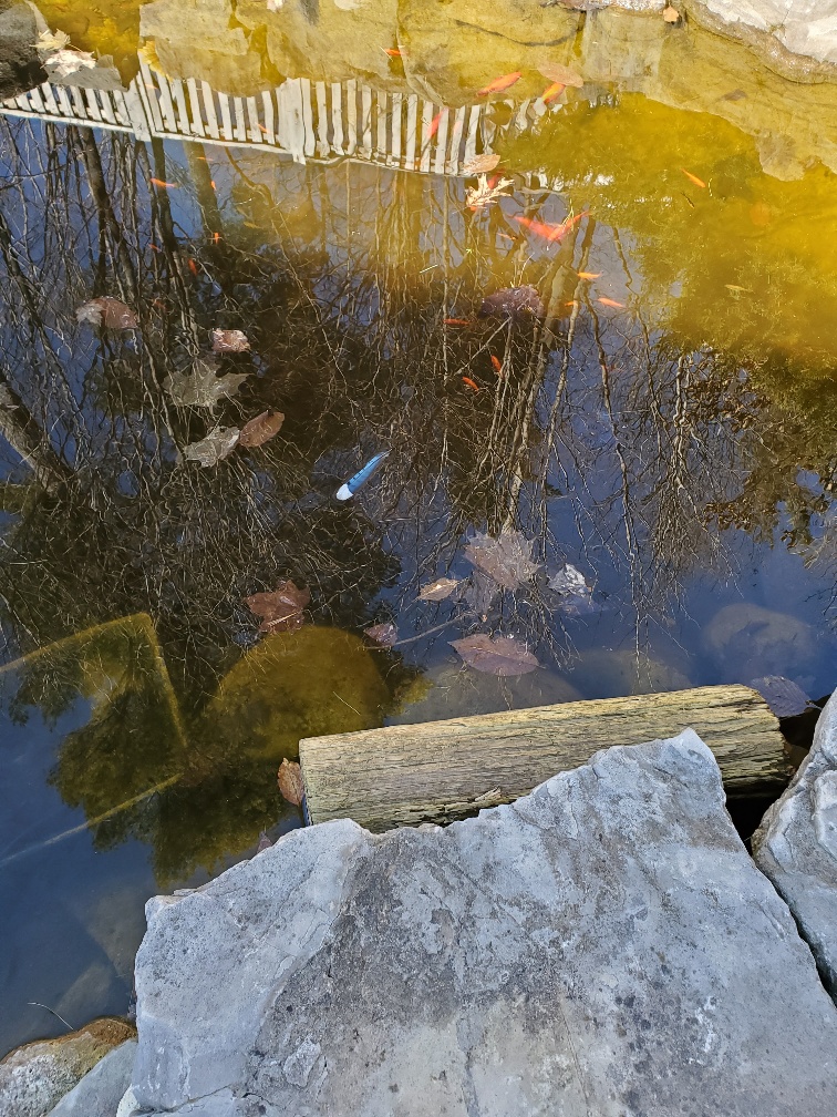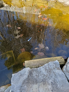 I saw this in the pond. What is that? It looks like a bluejay feather. I wonder what got him excited that he dropped a feather in the pond? Thankfully, it wasn't a heron feather.
