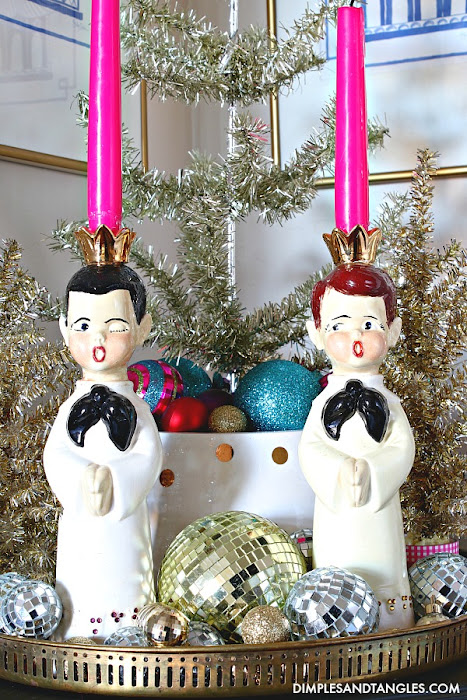 This is a weird little niche in our hall where I grouped some tinsel trees and vintage choir boy candleholders.