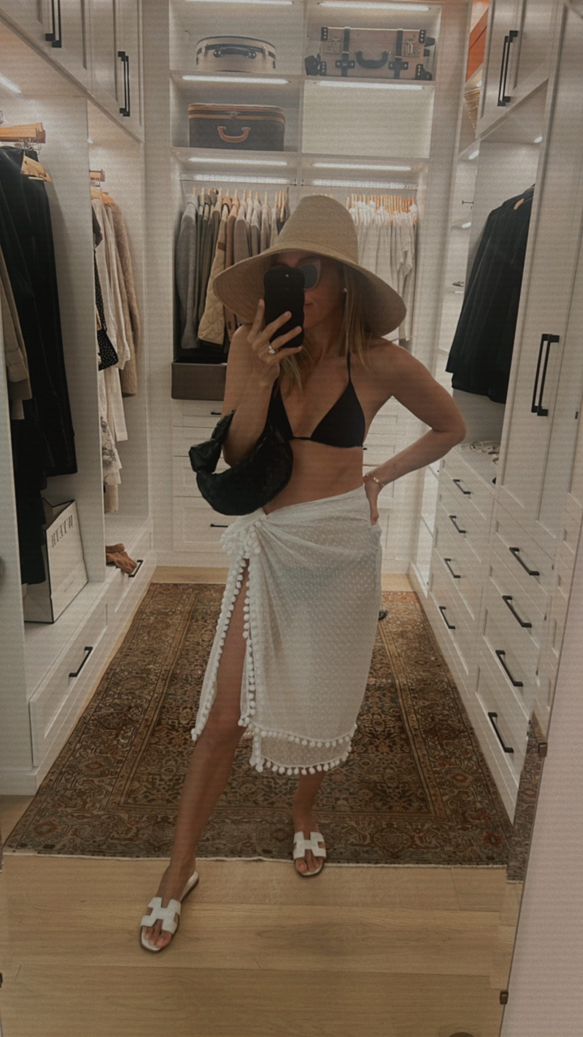 In case you caught a glimpse of the new all white set that I was wearing above with my Erés suit. I’m all about mixing high and lows and that’s what makes this incredibly affordable (read: $50) set look like a $500 set. I love the material and overall laid back vibe of this easy to wear set from Amazon. YSL tote is here + The Row sandals + Janessa Leone Hat