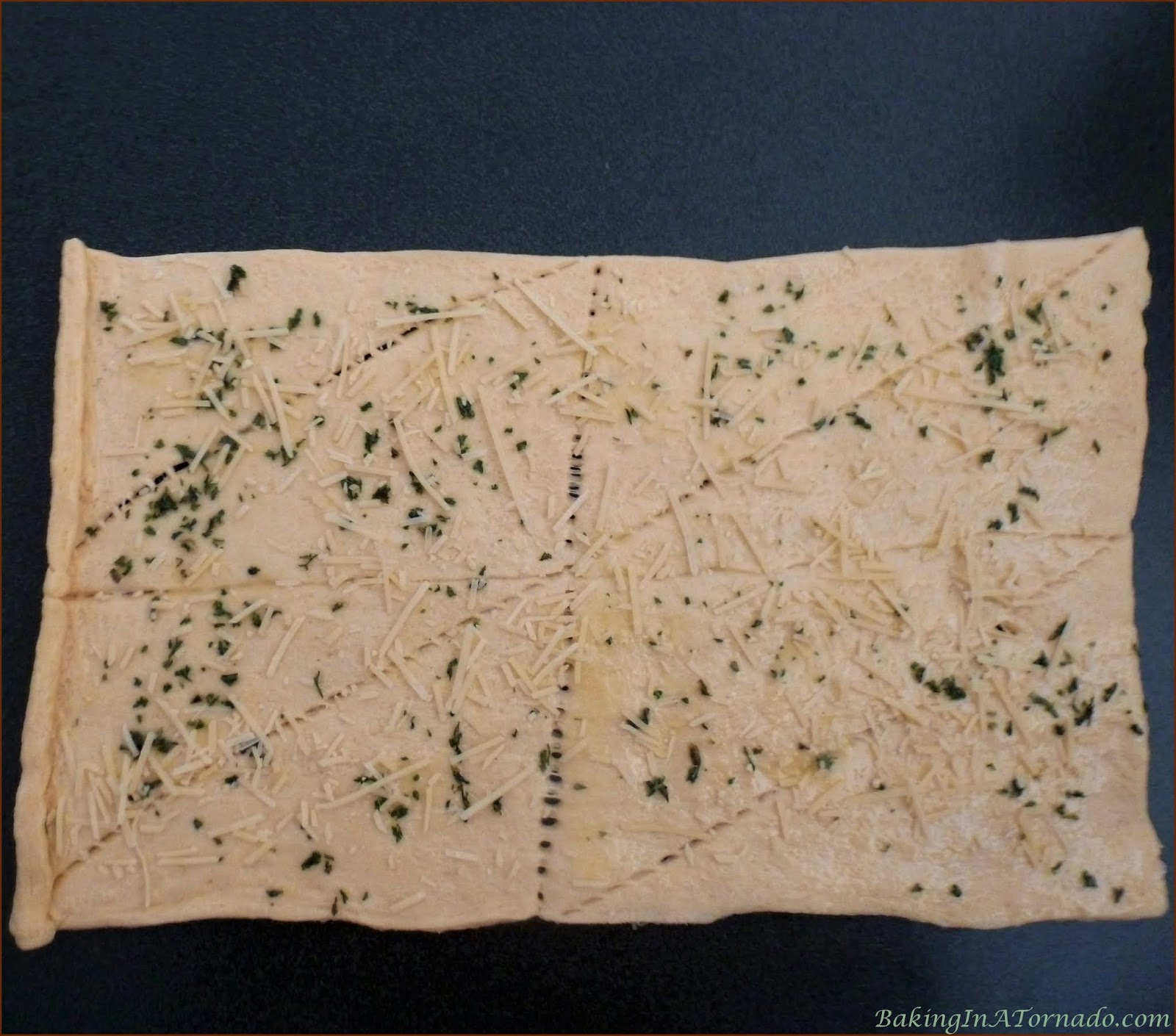 *Carefully unroll the dough. With a pastry brush, gently brush the dough with the butter mixture. Sprinkle with the Parmesan cheese.